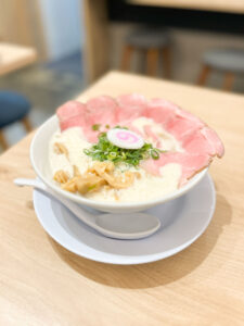 純白のスープに、花びらのようなレアチャーシューが美しいですね!