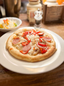 太極拳のお稽古の帰りに、桜山のタルボットさんでお昼。ソーセージと野菜のピザのふわふわ生地でめちゃくちゃ美味しかった。