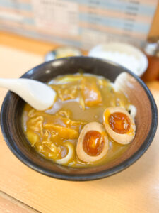 今日は風が冷たいので、お昼は名古屋葵大学の近くの若旦那21さんのカレーうどん、煮たまごトッピングに小ライス。名古屋のカレーうどんが大好き。