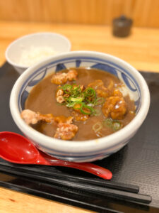太極拳のお稽古の帰りに、桜山の「うえだ」さんで鶏カレーうどん。唐揚げが入ってて最高だった。
